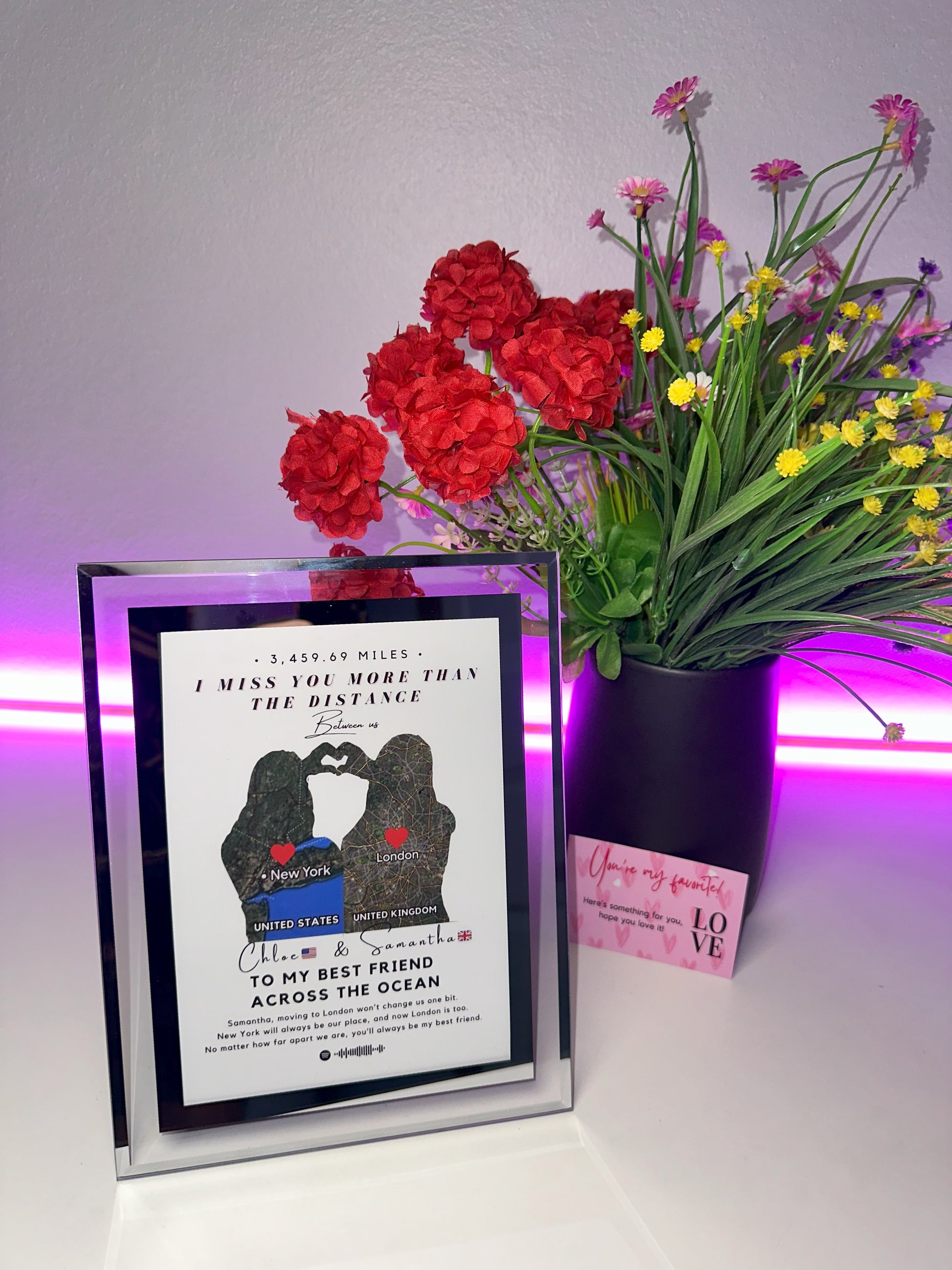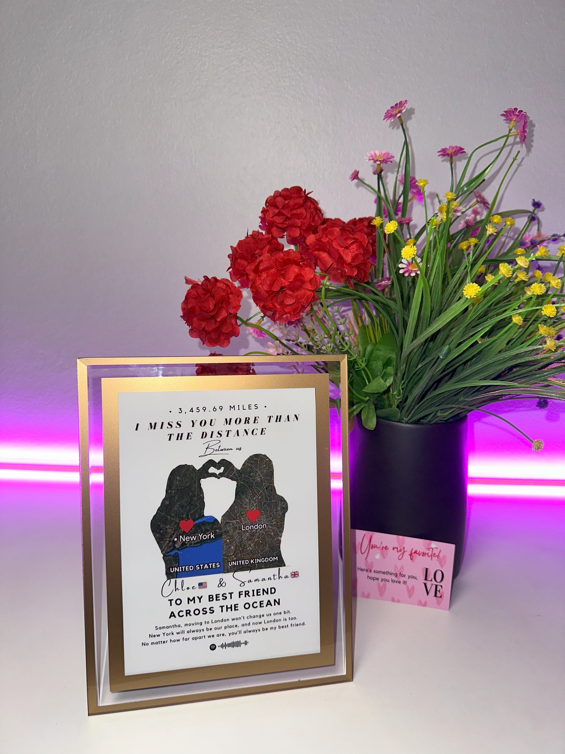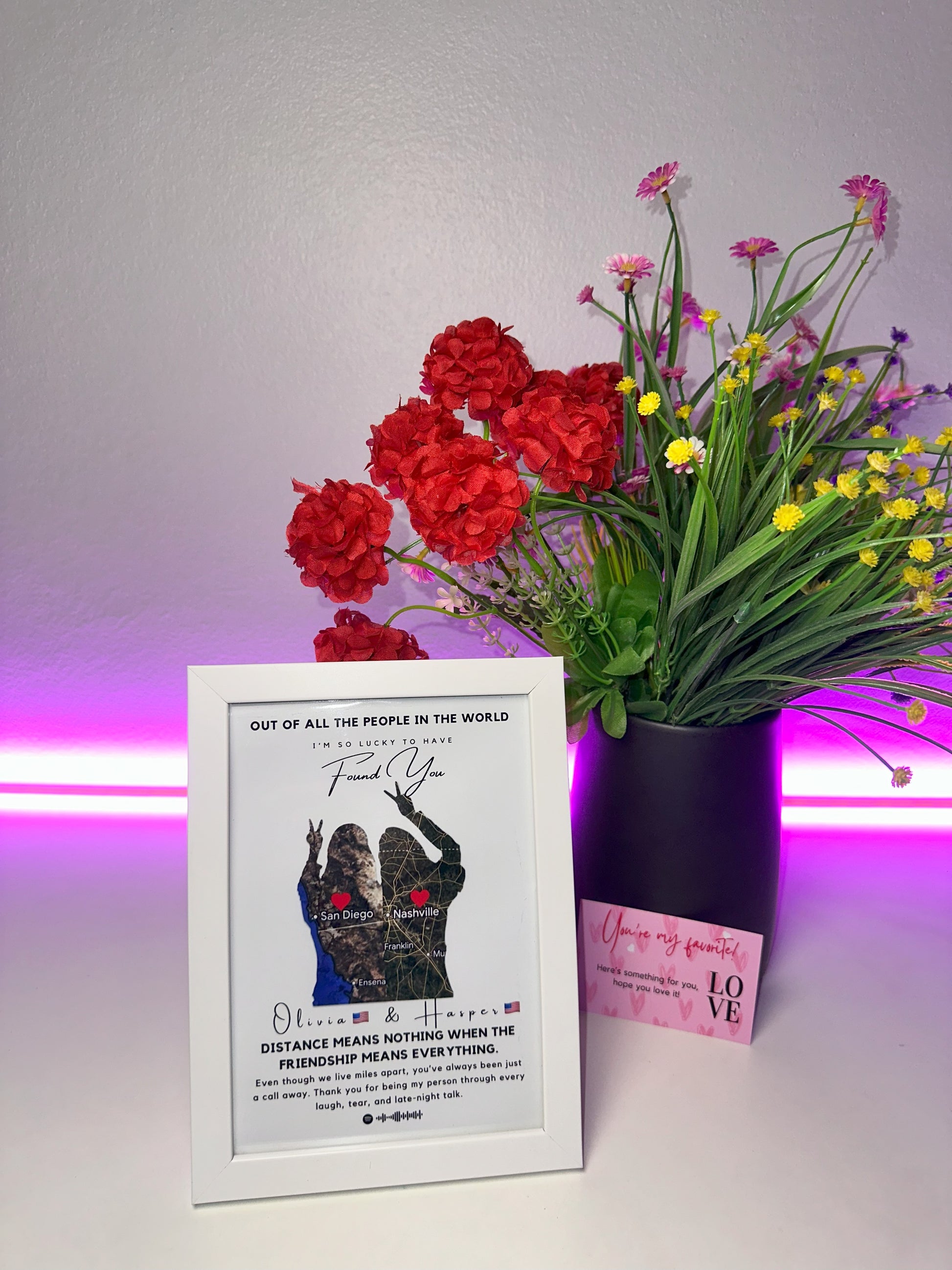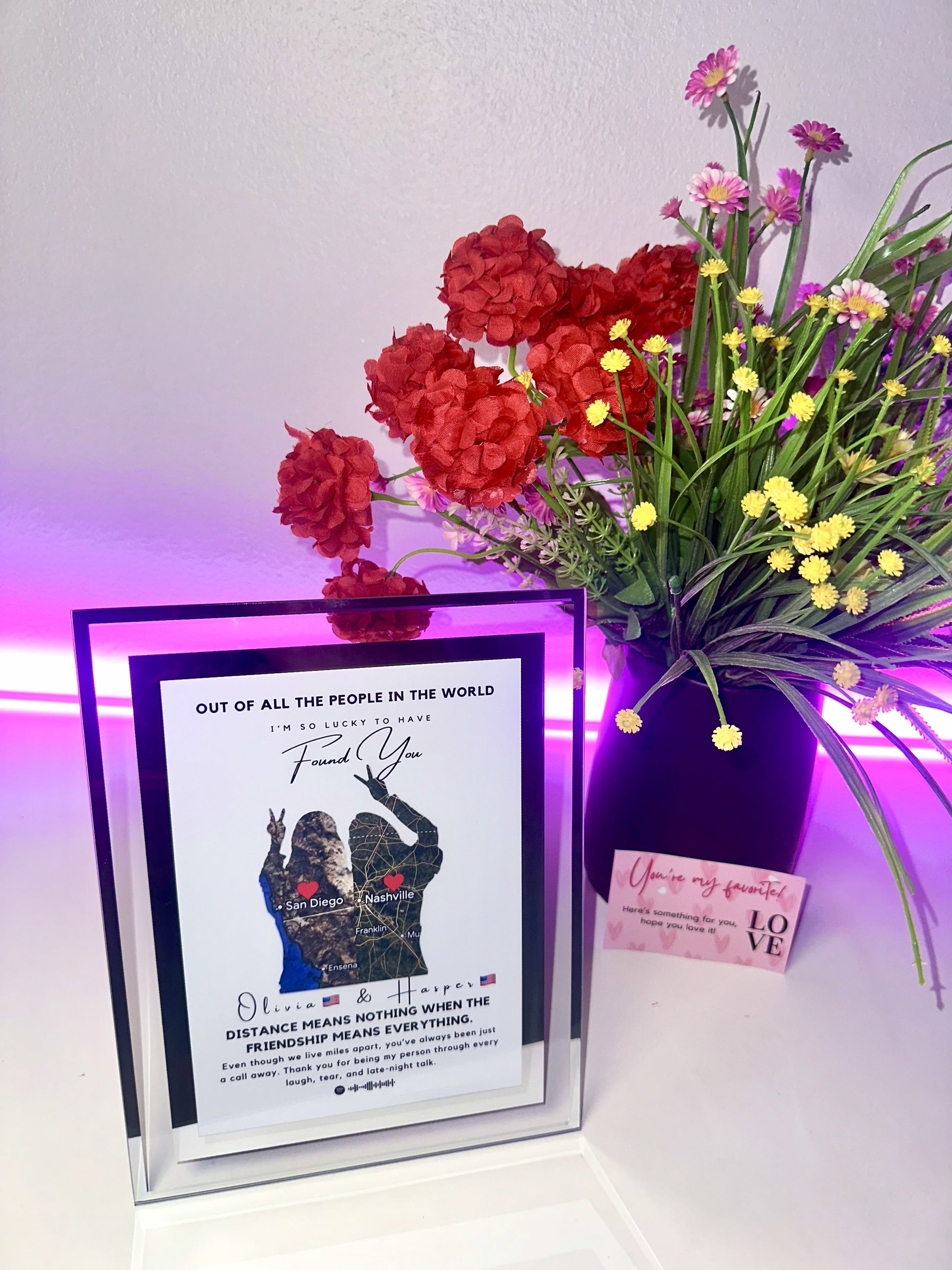 Celebrate your friendship across miles with our Besties Across Borders design. This print features two silhouettes overlaid with maps of your choice, along with the distance that connects you. A thoughtful keepsake that’s perfect for birthdays, holidays, or simply reminding them that no matter the distance, your bond remains strong.