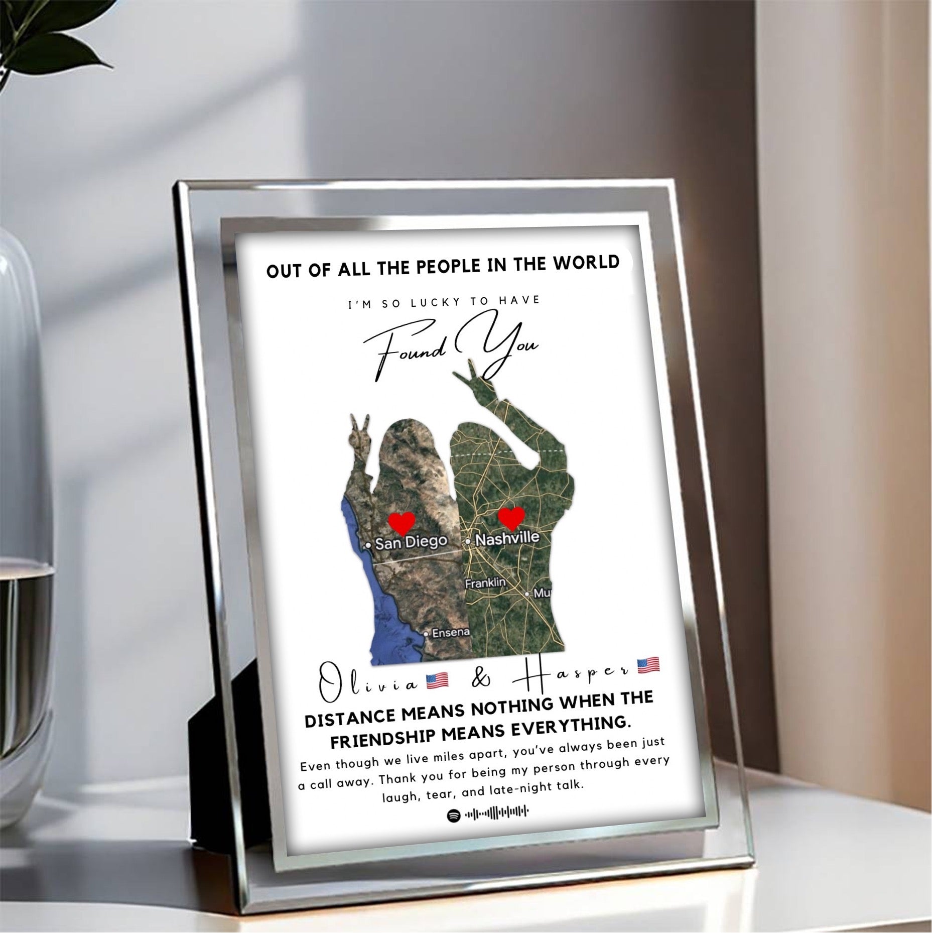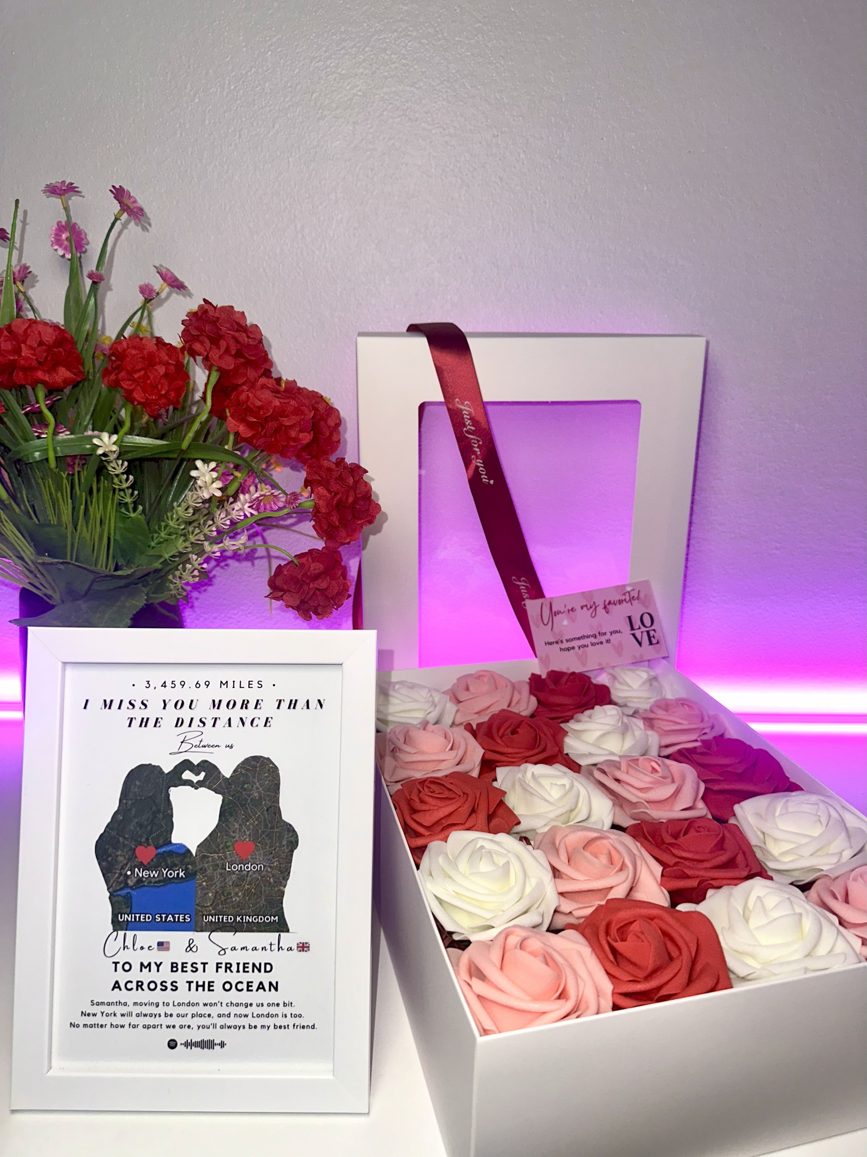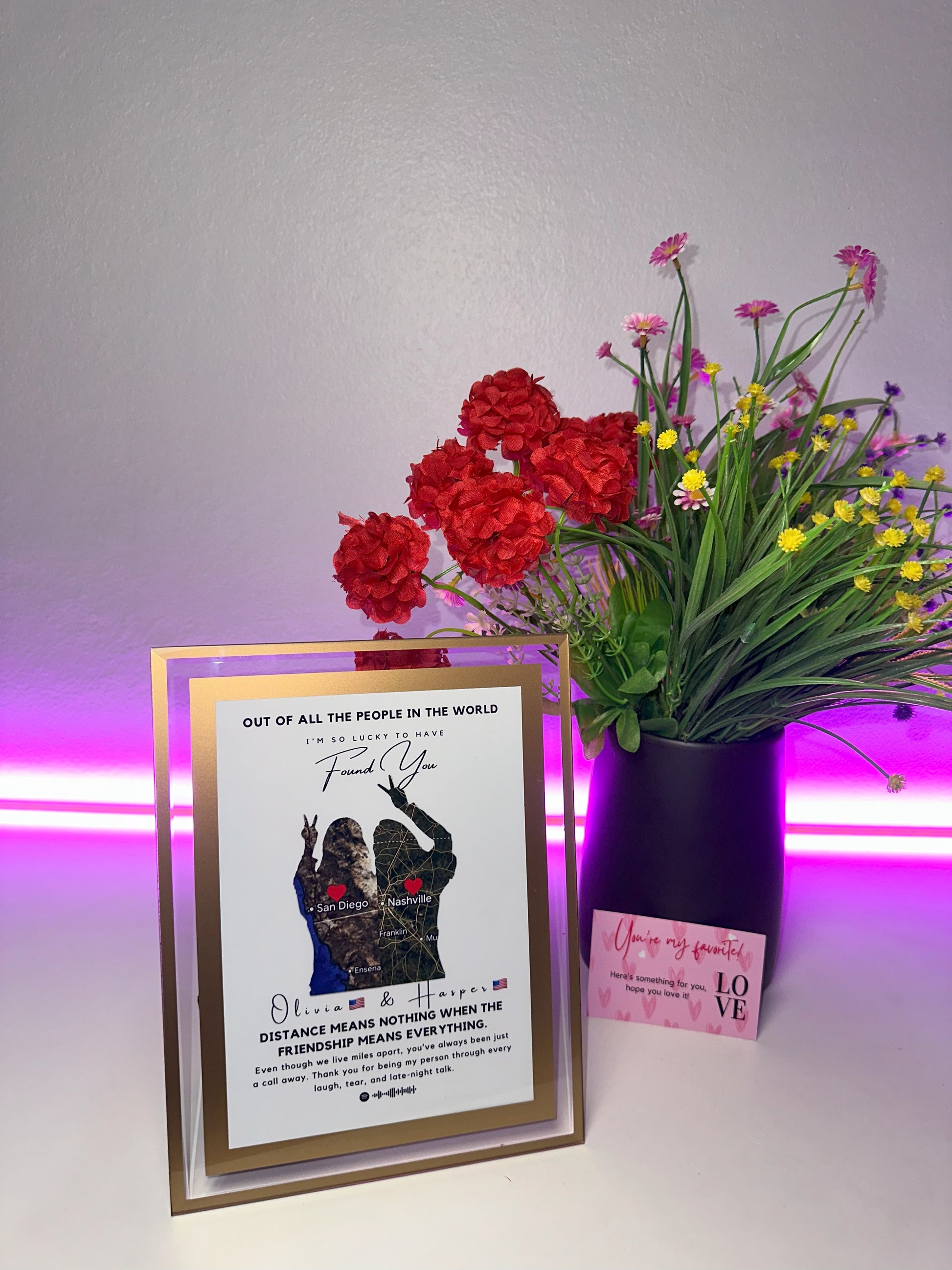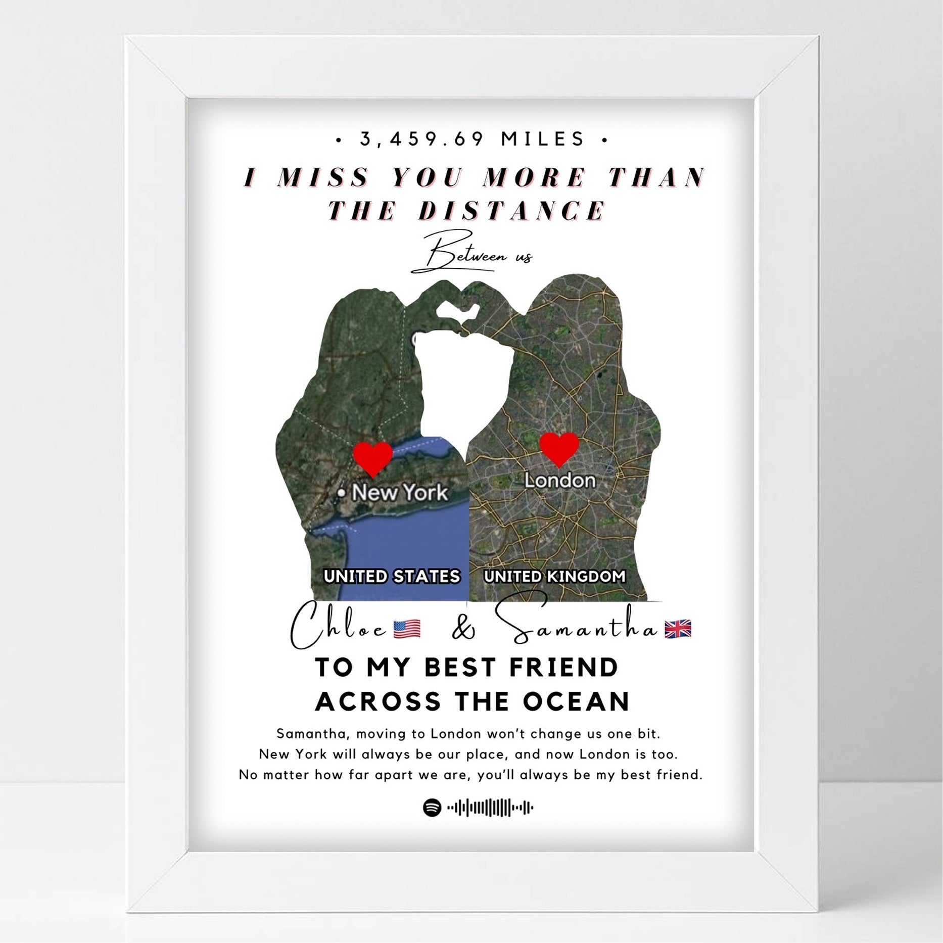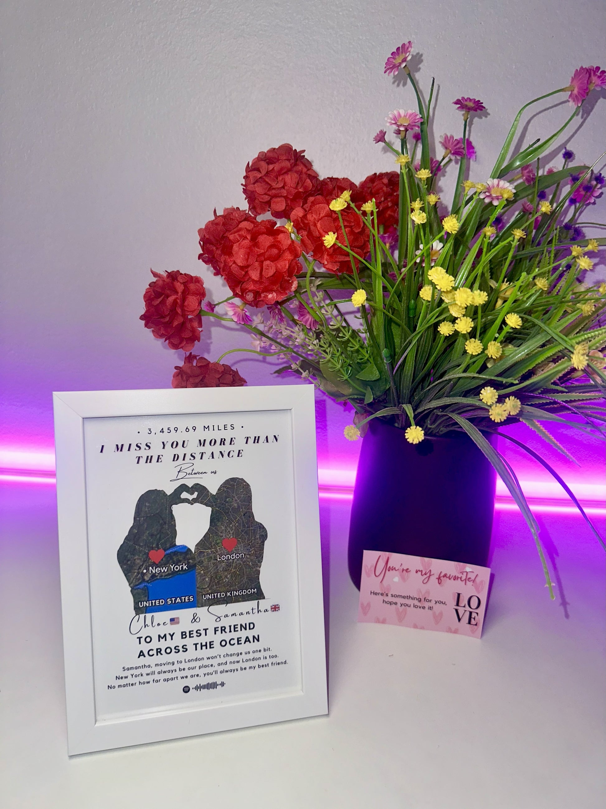 Celebrate your friendship across miles with our Besties Across Borders design. This print features two silhouettes overlaid with maps of your choice, along with the distance that connects you. A thoughtful keepsake that’s perfect for birthdays, holidays, or simply reminding them that no matter the distance, your bond remains strong.
