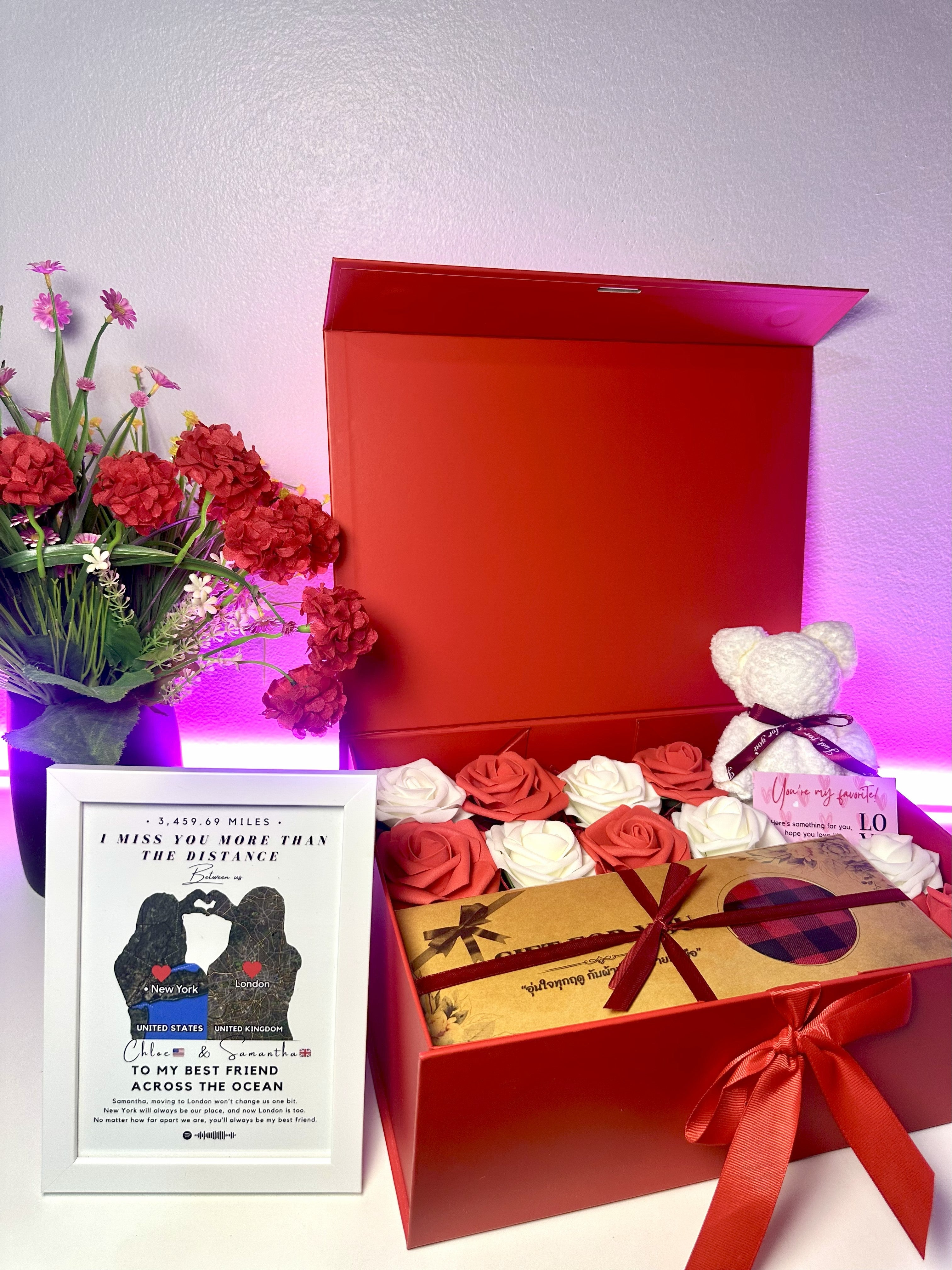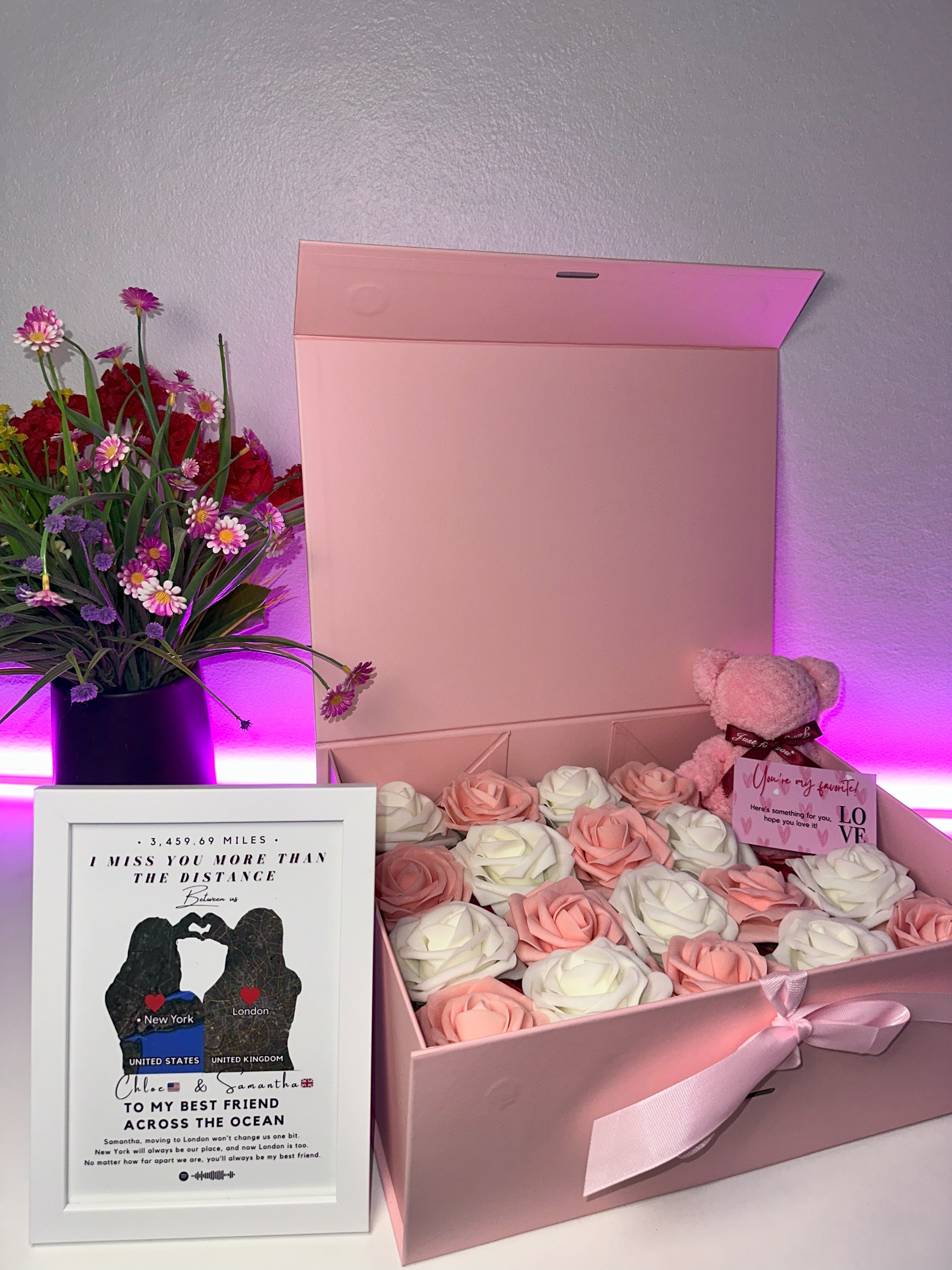 Present your framed print in a luxury gift box with roses and a teddy bear face towel