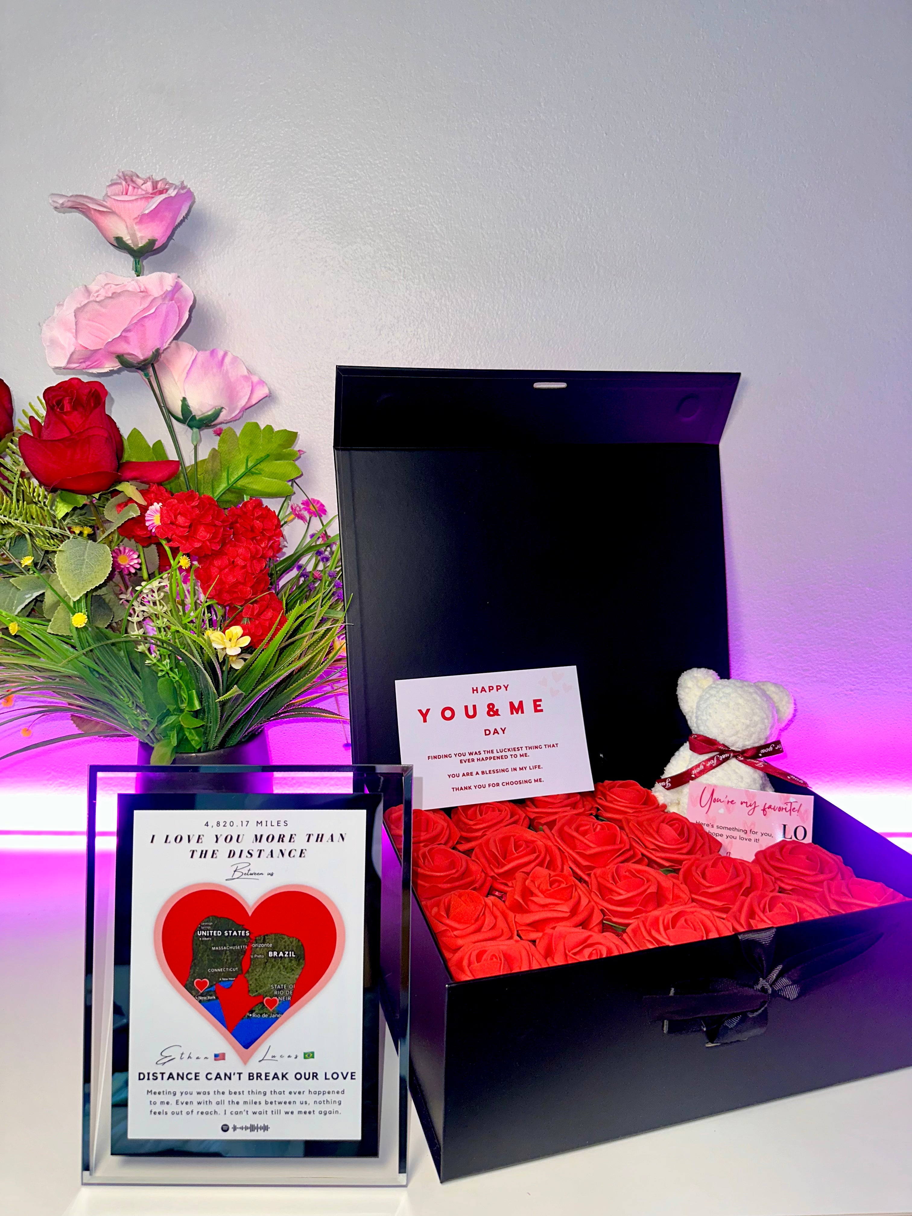 Present your framed print in a luxury gift box with roses and a teddy bear face towel