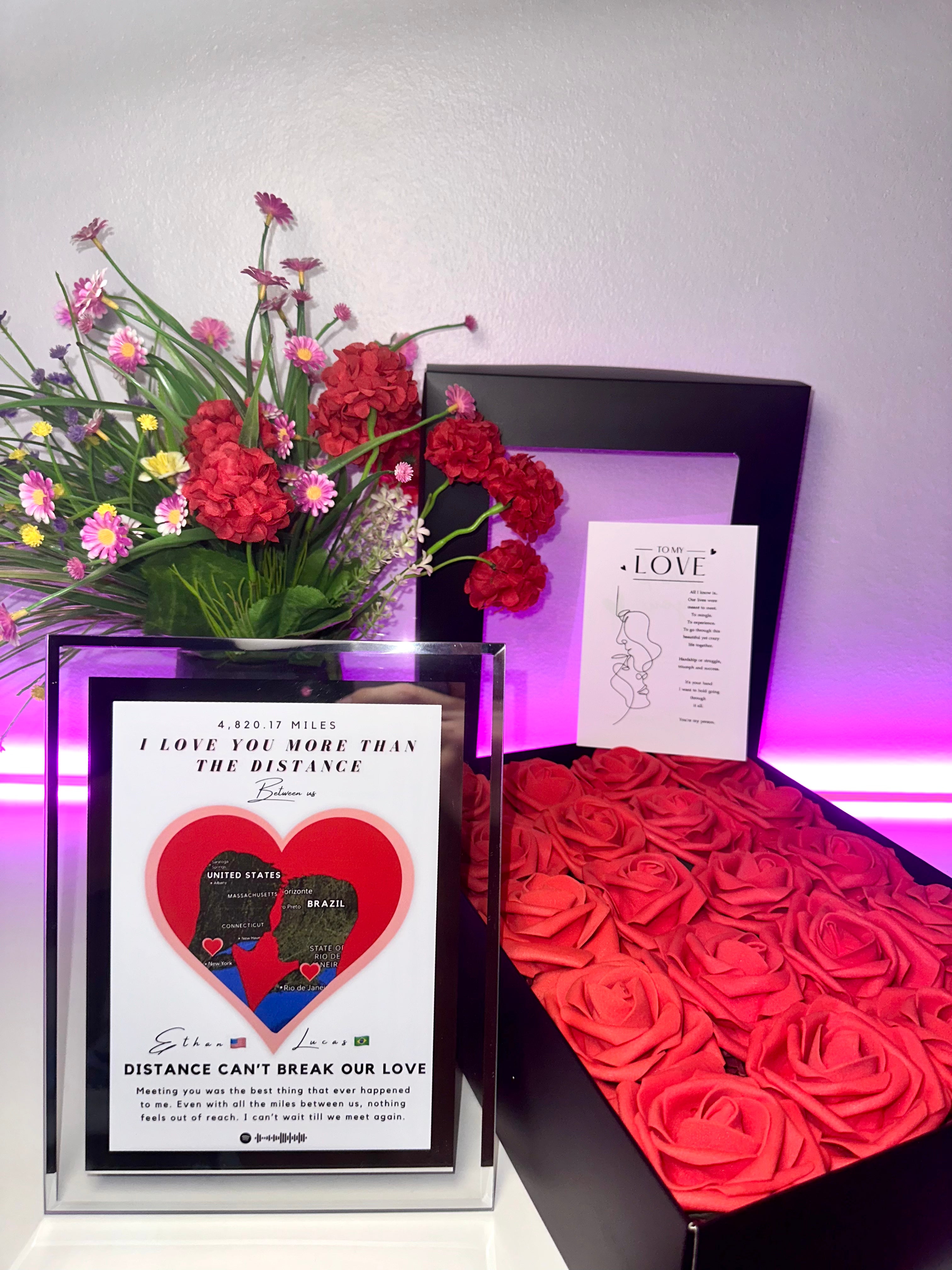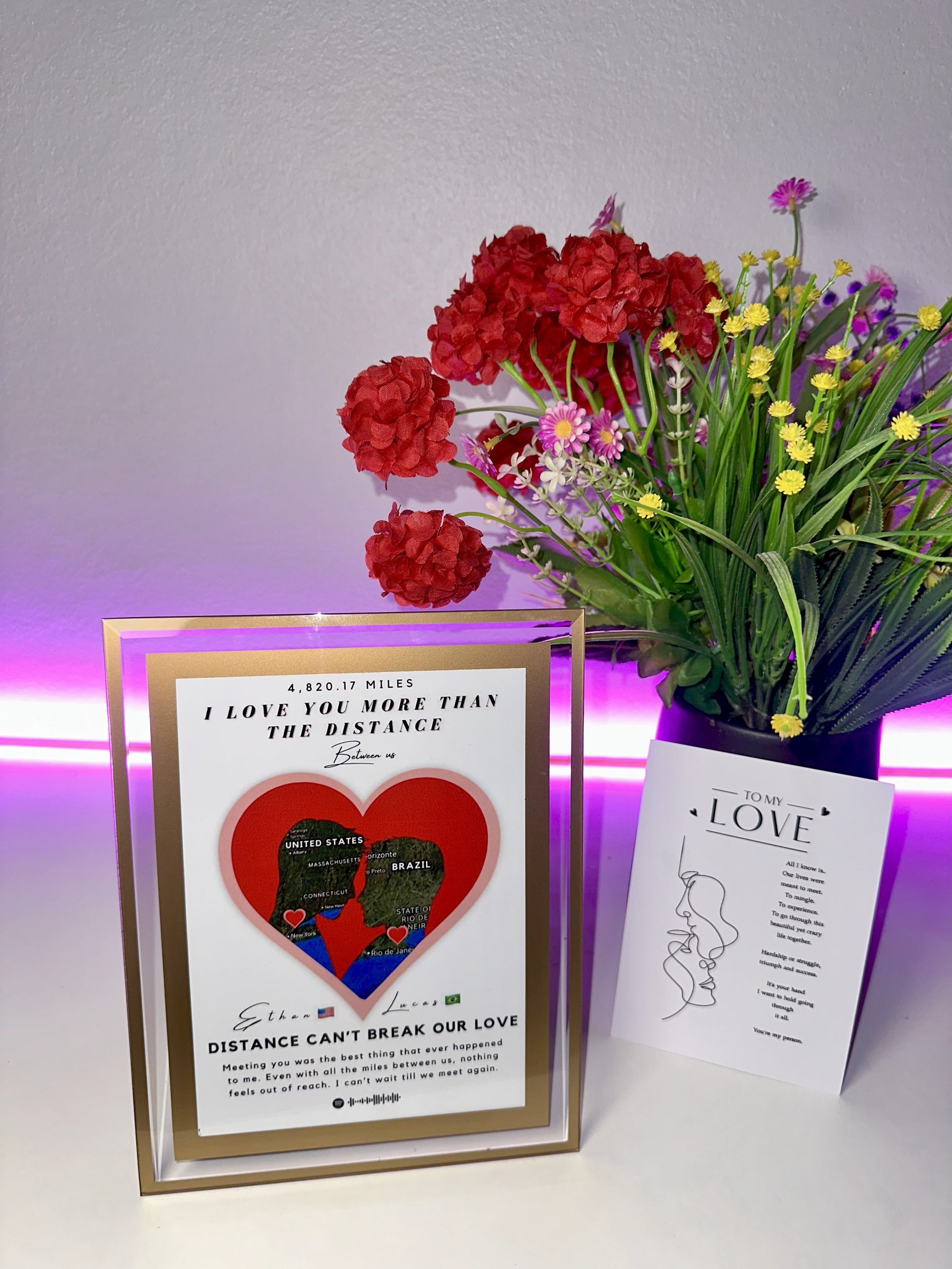 Maps of your cities are overlaid onto the couple silhouette and enclosed in a large heart. We calculate the miles between the cities, creating a meaningful, one-of-a-kind piece that tells your story.