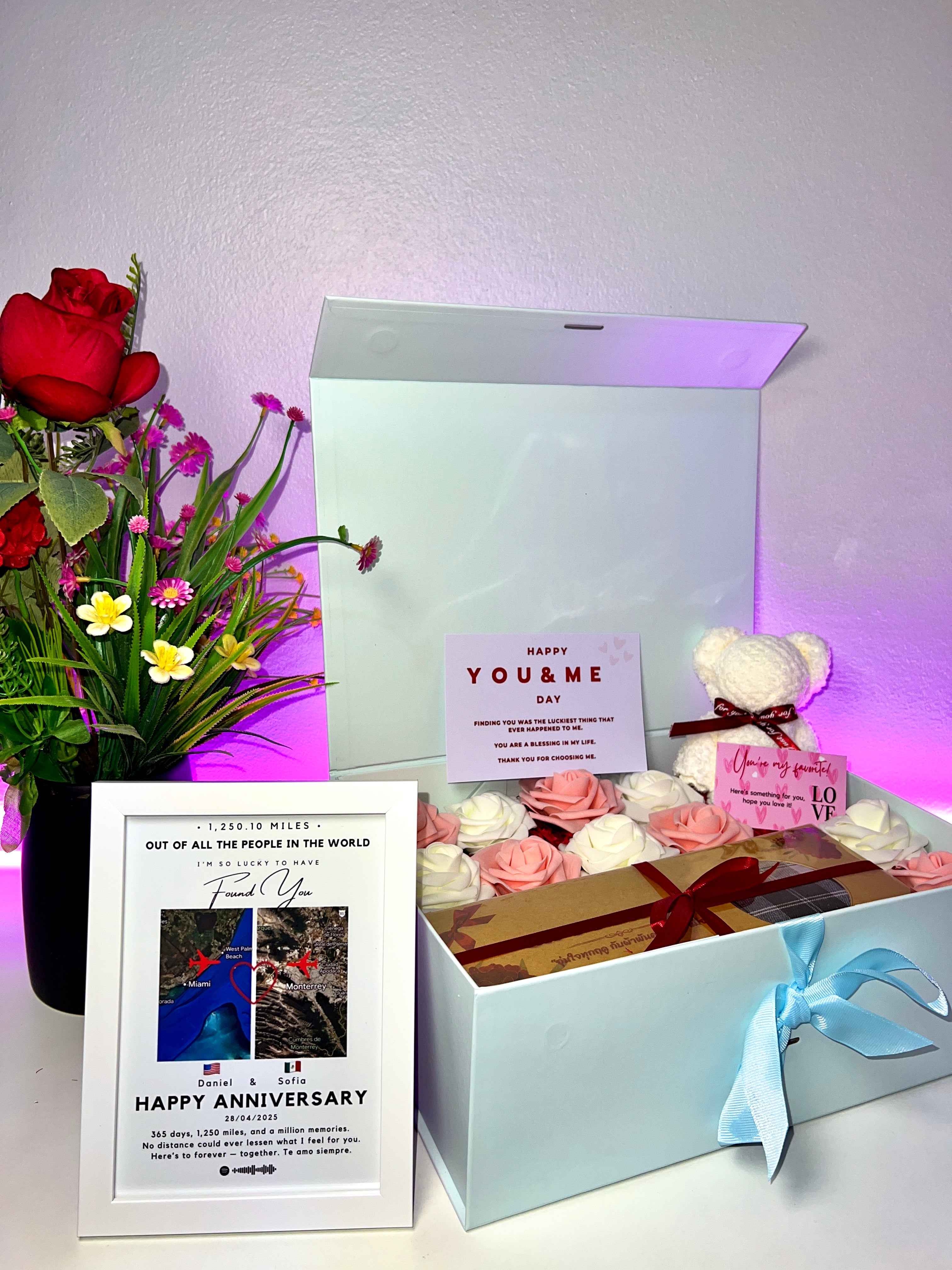 Present your framed print in a luxury gift box with roses and a teddy bear face towel